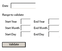 In diesem Beispiel wählt der Benutzer ein Datum aus dem Kalender aus und definiert Anfangs- und Enddaten, die dann mit dem ausgewählten Datum abgeglichen werden. Das Formular vergleicht das ausgewählte Datum mit dem Prüfbereich und zeigt eine Meldung bzgl. der Gültigkeit von Jahr, Monat und Tag an.