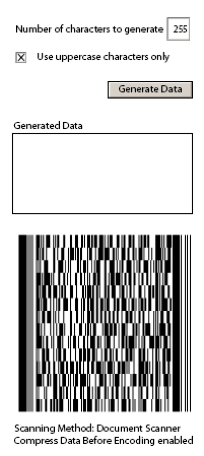 Bei Eingabe von weniger als 255 Zeichen und anschließendem Klick auf die Schaltfläche „Daten erstellen“ ändert sich in diesem Beispiel die Datenkapazität des Barcodes. Analog reduziert sich auch bei deaktiviertem Kontrollkästchen „Nur Großbuchstaben“ die Datenkapazität des Barcodes.