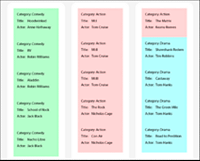 Die Teilformulare werden in einen Teilformularsatz zusammengefasst. In Designer kann die Anzeige von auf Datenfluss basierenden Teilformularen durch einen Teilformularsatz gesteuert werden. In diesem Beispiel wird das Teilformular „comedy“ jedes Mal angezeigt, wenn die Kategorie in den Daten ebenfalls „comedy“ lautet. Das Teilformular „action“ wird jedes Mal angezeigt, wenn die Kategorie in den Daten ebenfalls „action“ lautet. Das Teilformular „drama“ wird jedes Mal angezeigt, wenn die Kategorie in den Daten ebenfalls „drama“ lautet.