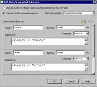 Die alternativen Teilformulare werden im Dialogfeld „Datenteilformulare bearbeiten“ festgelegt. Um dieses Dialogfeld anzuzeigen, markieren Sie den Teilformularsatz „Movie“, wählen in der Palette „Objekt“ die Registerkarte „Teilformularsatz“ aus und klicken dort auf die Schaltfläche „Alternativen bearbeiten“.