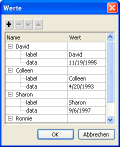 Klicken Sie auf das Pluszeichen, um in den Datenprovider ein Element einzufügen. Klicken Sie auf das Minuszeichen, um ein Element zu löschen. Klicken Sie auf den nach oben weisenden Pfeil, um ein ausgewähltes Element innerhalb der Liste nach oben zu verlagern bzw. auf den nach unten weisenden Pfeil, um das Element um eine Position nach unten zu verlagern. In der folgenden Abbildung sehen Sie das Dialogfeld „Werte“, mit dem eine Liste mit Namen und Geburtstagen von Kindern erstellt wird.
