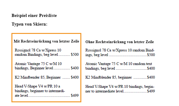 Sie können die Funktion für die Rechtseinrückung der letzten Zeile verwenden, um Text in der letzten Zeile eines Absatzes zu isolieren und deutlich anzuzeigen. Beispiele: Die Seitenzahlen für eine lange Überschrift in einem Inhaltsverzeichnis oder die Preise für einen langen Artikel in einer Preisliste.