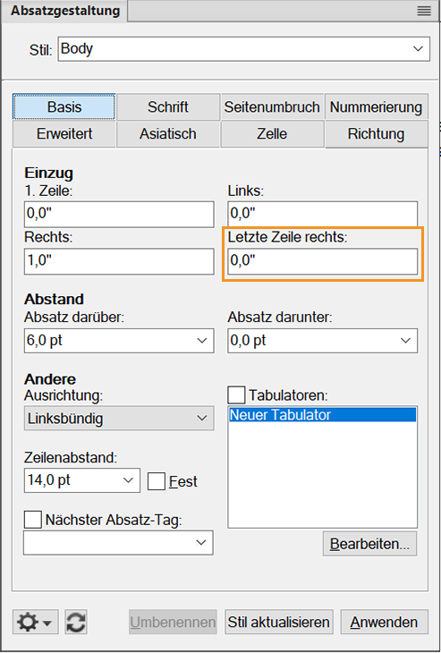 Wenn Sie einen Einzugswert verwenden möchten, zeigen Sie im Dialogfeld Absatzgestaltung die Basiseigenschaften an. Geben Sie die gewünschten Einzüge in die Felder 1. Zeile, Links und Rechts ein, und klicken Sie anschließend auf Anwenden.
