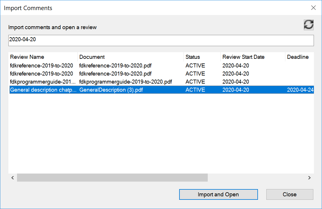Wählen Sie in der Liste Kommentare importieren die Datei aus, aus der Sie Reviewkommentare importieren möchten.