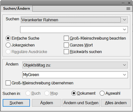 Wenn Sie alle Objekte durchsuchen möchten, auf die ein oder kein Objektstil angewendet wurde, wählen Sie „Verankerter Rahmen“ aus der Dropdown-Liste Suchen aus. Damit können Sie alle in verankerten Rahmen vorhandenen Objekte einfacher durchsuchen und allen Objekten in einem Durchgang einen bestimmten Objektstil zuweisen.