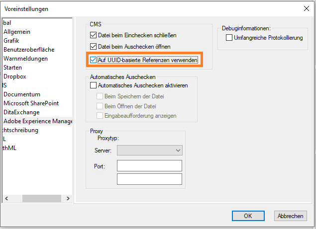Zur Unterstützung UUID-basierter Referenzen in Dateien wurde die neue Option Auf UUID-basierte Referenzen verwenden in die Voreinstellungen des AEM-Connectors aufgenommen. Diese Option ist standardmäßig nicht aktiviert. Wählen Sie Auf UUID-basierte Referenzen verwenden. und wählen Sie |