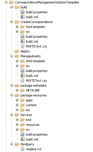 • build – Dieser Ordner enthält das Build-Skript auf oberster Ebene, das die gesamte Lösungsvorlage kompiliert und ein bereitstellbares CRX-Paket template-correspondencemanagement-pkg.zip im Bereitstellungsordner erstellt.