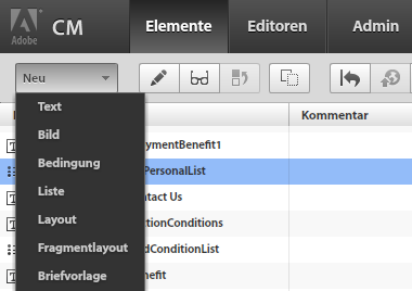Elemente erstellenUm ein Element zu erstellen, wählen Sie die Dropdown-Liste Neu aus, um den für das Element, das Sie erstellen, passenden Elementeditor zu starten.