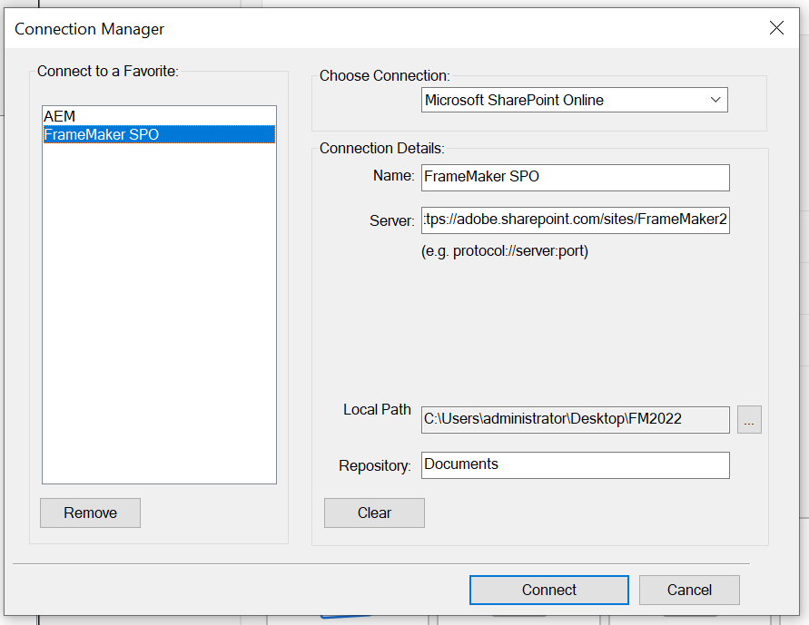 Understand how you can setup a Microsoft SharePoint Online connector with Adobe FrameMaker using the Connection Manager dialog