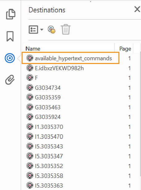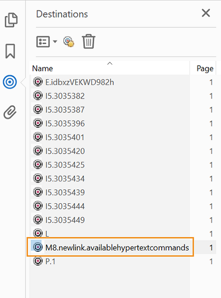 For example, if you create a named destination available_hypertext_commands then earlier, the named destination in your PDF output had some additional characters and could be displayed M8.newlink.availablehypertextcommands. Now FrameMaker retains the original text in the named destination, and it is called available_hypertext_commands in the PDF output.