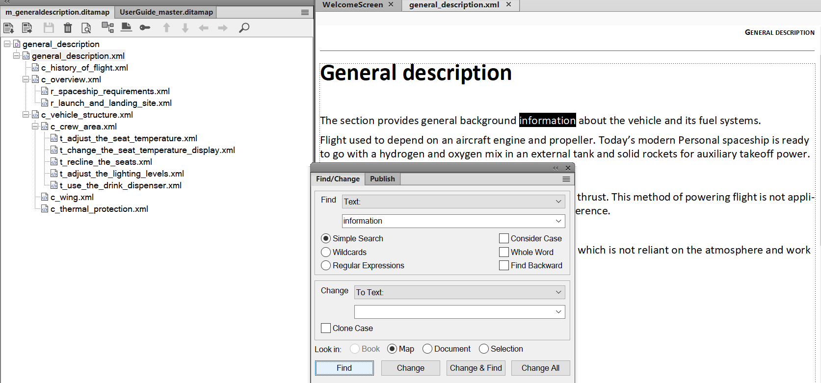 The find and replace is a key feature of FrameMaker that helps you search and modify different types of content within your documents. Now FrameMaker also provides you the capability to search within the nested DITA maps. For example, you can search for a text, and FrameMaker searches all the child maps nested in the current map. This feature also lets you quickly locate and update specific text in your documents irrespective of where they are in your DITA map hierarchy.