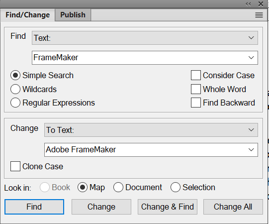 The following screenshot displays the Find/Change dialog in FrameMaker.
