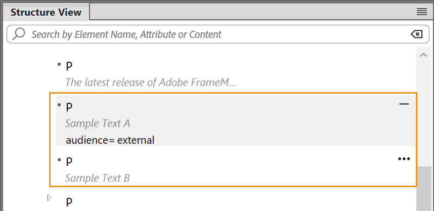 Change attribute values: If your element contains an attribute, a three dots sign appears against it. The following example shows the elements that have attributes associated with them: