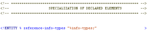 In the Specialization Attribute Declarations section, declare the element from which the specialized element is derived. You must declare the hierarchy down to the base <topic> or <map> type (starting with a “-” for structural specialization). For example, if the specialized element is derived from a reference element, include the complete hierarchy: