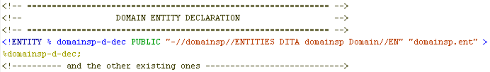 Open the new mod file, domainsp.mod. In the section Element Name Entities, declare the new entities for the specialized elements.