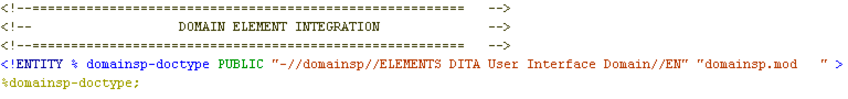 Integrate the specialized .mod file with the existing ones by modifying ditabase.dtd. For domain specialization, specify both the .mod and .ent files in the ditabase.dtd as follows: