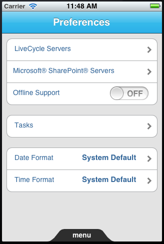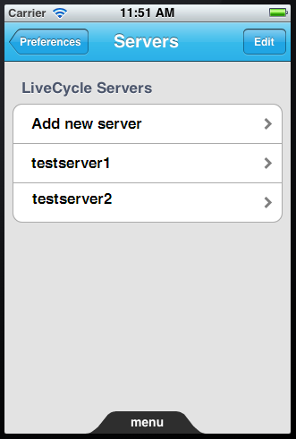 Add a LiveCycle Server to your list of available servers Tap menu at the bottom of the screen and