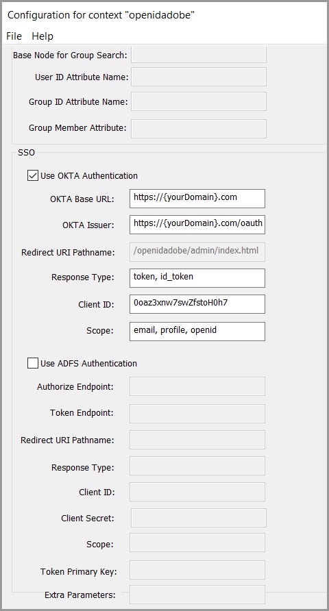 To use Single Sign-On (SSO) authentication via OKTA for RoboHelp Server, configure the OKTA settings in the SSO section of the Configuration Manager. The description of the required fields are as follows: