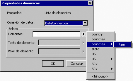 puede escribir esta cadena en el cuadro Elementos en lugar de seleccionarla. Nota: para conexiones de datos OLEDB, el cuadro Elementos no está disponible. Utilice los cuadros Texto de elemento y Valor de elemento para seleccionar las columnas de la base de datos y rellenar la lista.