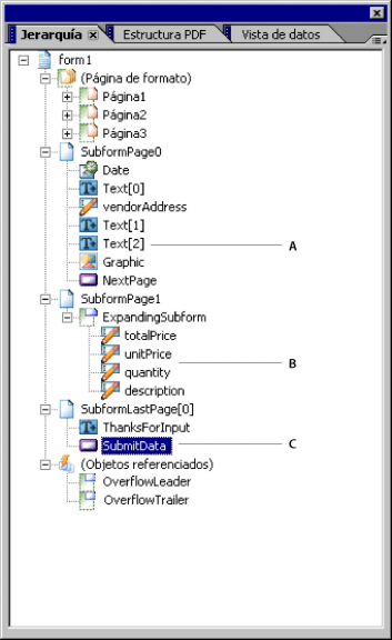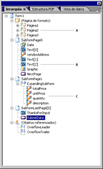 - Subformulario_Página1 contiene un subformulario con posición variable. Subformulario_ampliable puede repetir la representación de los objetos tantas veces como sea necesario de acuerdo con los datos combinados. El contenido de Subformulario_Página1 se puede mostrar en una o varias páginas usando la presentación de la página de formato Página2_etc.