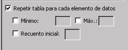 Si selecciona una tabla con un número fijo de filas y columnas y hace que ésta sea opcional, la fila de encabezado se repetirá en cada elemento de datos. Para cambiar esta tabla por una en la que el número de filas cambie en función de los datos, borre la opción Repetir fila para cada elemento de datos en la fila de encabezado, y seleccione esta misma opción (Repetir fila para cada elemento de datos) en la fila de trabajo.