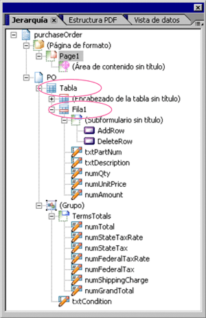 Para modificar la secuencia de comandos para su propio formulario, debe comprender cómo se relaciona la secuencia de comandos con la jerarquía. Por ejemplo, en la jerarquía del formulario actual, ambos botones se encuentran dentro del mismo subformulario, por lo que no tiene que especificar ningún objeto más allá del nivel Tabla.