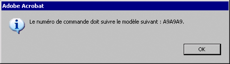 Cuando combina el archivo de datos con el diseño de formulario, y escribe un número en el campo Número de orden que no coincide con el patrón esperado, aparece un cuadro de diálogo de error en francés.