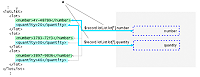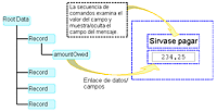 El siguiente diagrama muestra el ejemplo de enlace de campo en el que dos objetos de campo del formulario están enlazados a los elementos de datos. El enlace es ambiguo porque existen varias instancias de los objetos de campo y de sus datos. Es necesario un mayor procesamiento para que coincida un determinado número de incidencia de cada objeto con un determinado número de incidencia de los datos correspondientes cuando se procesa el formulario.