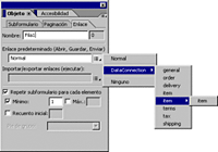 Haga clic en el triángulo junto al cuadro Enlace de datos (Abrir, Guardar, Enviar) y seleccione un enlace. Por ejemplo, seleccione ConexiónDatos > elemento > elemento.