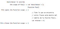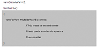 Por el contrario, el siguiente ejemplo muestra un ámbito no válido porque la función var nOutsideVar = nFooVar no puede acceder a la función que aparece entre llaves, var nFooVar =4.