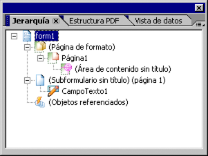 Por ejemplo, cuando se crea un nuevo formulario en blanco, de forma predeterminada el nombre del subformulario que representa la primera página del formulario es un subformulario sin nombre con un valor de incidencia de 0. La siguiente ilustración muestra la jerarquía de un formulario nuevo con la nomenclatura de objetos predeterminada.