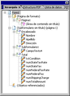 La sintaxis de referencia se abrevia bien porque se indica la posición relativa del cálculo o la secuencia de comandos que contienen la sintaxis de referencia y de las referencias de la sintaxis de objeto o bien porque se emplean métodos abreviados. En general, aunque las sintaxis de referencia abreviadas se crean más rápidamente, presentan la desventaja de que sólo funcionan mientras los objetos permanezcan en la misma posición relativa.Por ejemplo, la siguiente ilustración muestra la jerarquía de un formulario de orden de compra de ejemplo.