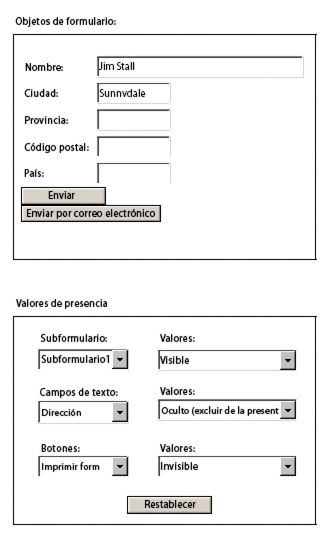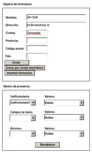 Este ejemplo muestra cómo ocultar botones al imprimir un formulario. También muestra cómo ocultar y mostrar objetos modificando los valores de presencia en tiempo de ejecución.