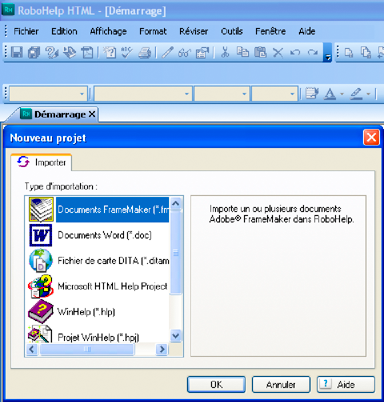 Dans l’onglet Importer de la boîte de dialogue Nouveau projet, sélectionnez Document FrameMaker, puis cliquez sur OK.