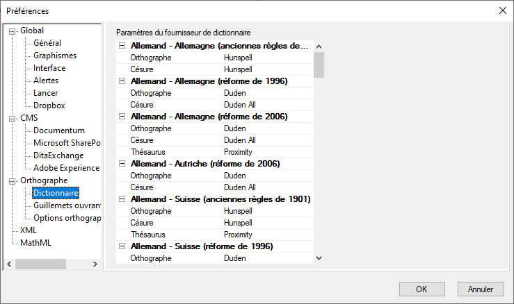 La prise en charge des dictionnaires allemands a été complètement revue. Depuis le dictionnaire Hunspell précédent, FrameMaker prend désormais en charge le dictionnaire Duden pour les utilisateurs allemands. Le dictionnaire Duden est régulièrement mis à jour et est l’un des plus utilisés par les utilisateurs allemands.
