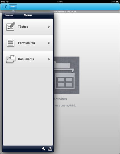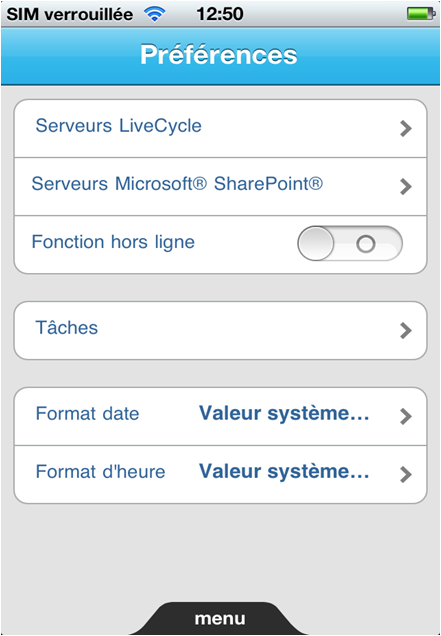 (iPad) Dans le menu principal, appuyez sur l’icône Préférences au bas de l’écran. L’écran Paramètres LiveCycle apparaît.