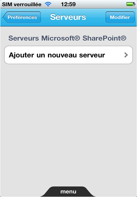 Ajout d’un serveur Microsoft SharePoint à la liste des serveurs disponibles Appuyez sur menu au bas de l’écran, puis sur . L’écran Préférences apparaît.