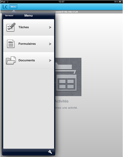 Remarque : sur iPad, appuyez sur la flèche en regard d’un nom de serveur pour afficher les paramètres du serveur. Si vous appuyez sur le nom du serveur, vous revenez au menu permettant d’accéder aux tâches, formulaires et documents.