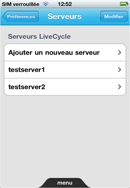 Ajout d’un serveur LiveCycle à la liste des serveurs disponibles Appuyez sur menu au bas de l’écran, puis sur . L’écran Préférences apparaît alors.