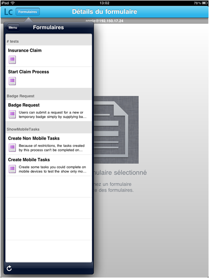 La liste Formulaires contient l’ensemble des formulaires que vous pouvez initier à partir de votre périphérique, classés par catégories Vous pouvez effectuer un glissement vers le haut et vers le bas pour faire défiler la liste. Pour ouvrir un formulaire à renseigner, appuyez sur le nom correspondant. Le formulaire s’affiche à droite de la liste Formulaires.