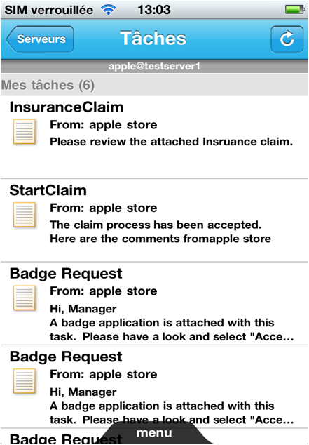 Pour accéder à la liste Tâches, appuyez sur menu au bas de l’écran LiveCycle Mobile, puis sur l’icône Tâches