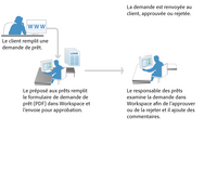 Envoi et approbation à l’aide d’un guide (obsolète)Dans cet exemple, le client d’une banque sollicite un prêt via un portail bancaire. Le client complète, signe et soumet une demande via un guide (obsolète), puis Workspace est utilisé pour examiner la demande de prêt. Une fois la demande approuvée ou rejetée, elle est renvoyée au client.