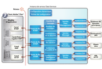 Data Management Service, Message Service et Remote Procedure Call (RPC) sont tous construits sur une infrastructure de messagerie centrale. Data Services utilise l’infrastructure de messagerie et le protocole Action Message Format (AMF) pour assurer des performances optimales. Vous pouvez également utiliser d’autres protocoles, tels que HTTP et RTMP (Real Time Messaging Protocol, protocole de messagerie en temps réel).