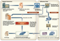 En option, les utilisateurs peuvent créer un processus avec Workbench afin d’inclure des processus d’entreprise propres à Reader Extensions. Une fois intégré à d’autres modules par le biais de processus conçus dans Workbench, un seul processus de formulaires unifié peut aisément prendre en charge l’envoi de différents formulaires papier associés à des flux de production spécifiques (voir également Installation de LiveCycle Workbench 10).