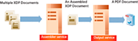 Vous pouvez utiliser conjointement les services Output et Assembler pour créer un document hautement personnalisé. Le service Assembler assemble un document XDP (une conception de formulaire), constitué de plusieurs formulaires XDP et de fragments contenus dans plusieurs fichiers XDP. Le document XDP assemblé est transmis au service Output, qui crée ensuite un document PDF.