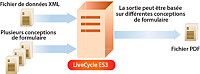 Vous pouvez créer des règles de correspondance au modèle, permettant ainsi au service Output d’examiner les données d’entrée et d’utiliser des conceptions de formulaire différentes, basées sur le contenu des données. Par exemple, si le texte immobilier figure dans les données d’entrée, le service Output peut utiliser une conception de formulaire nommée Immobilier.xdp. De même, si le texte automobile figure dans les données d’entrée, le service Output peut utiliser une conception de formulaire enregistrée comme PretAutomobile.xdp. Le schéma suivant illustre le service Output générant un fichier PDF en traitant un fichier de données XML et en utilisant une des nombreuses conceptions de formulaire.