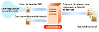 Le service Output peut créer des documents distincts pour chaque enregistrement dans une source de données XML. Il peut également créer un fichier unique contenant tous les enregistrements (fonctionnalité par défaut). Imaginons qu’une source de données XML contienne dix enregistrements et que vous demandiez au service Output de créer un document distinct pour chaque enregistrement (des documents PDF, par exemple). Le service Output génère alors dix documents PDF.