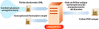 L’illustration suivante montre le service Output, qui traite un fichier de données XML contenant plusieurs enregistrements. Cependant, si vous demandez au service Output de créer un document PDF unique contenant tous les enregistrements de données, le service Output génère un document contenant tous les enregistrements.