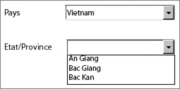 Ad esempio, dopo che è stato selezionato Vietnam dall'elenco a discesa, gli elementi nell'elenco Regioni/Province mostrano solo quelli che si applicano a Vietnam.