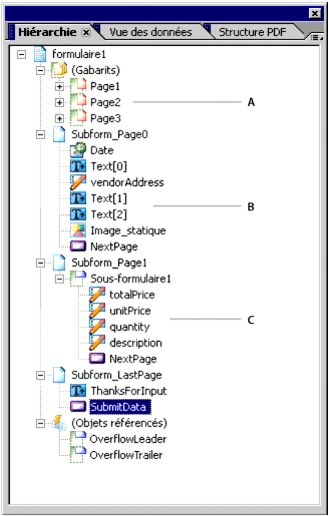 Ad esempio, osservare la struttura del modulo presentata nella seguente illustrazione. La struttura del modulo include tre sottomoduli a livello di pagina: Subform_Page0, Subform_Page1 e Subform_LastPage. Se Forms dovesse eseguire il rendering di un modulo HTML basato su questa struttura del modulo, verrebbe automaticamente creata una pagina HTML per ogni sottomodulo a livello di pagina.